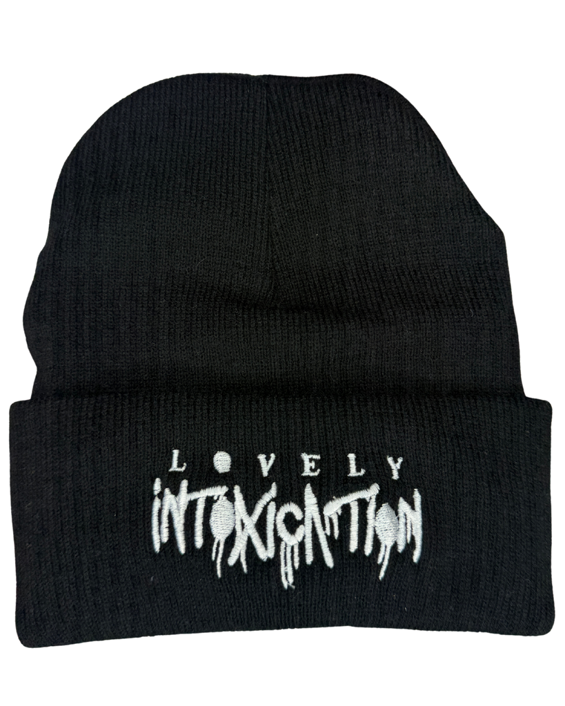 Black beanie embroidered with white stitching.