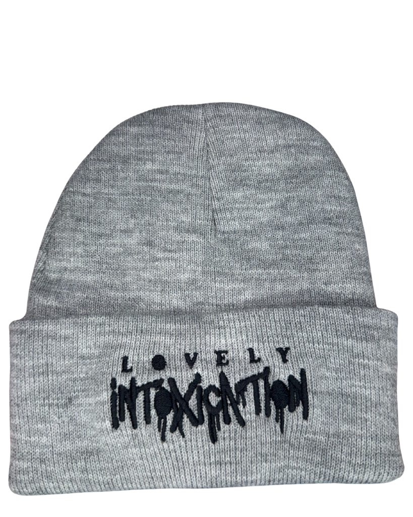 Light grey beanie embroidered with white stitching.