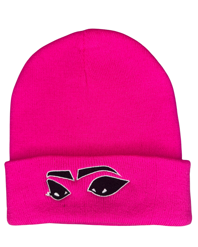 Hot pink beanie embroidered with black lovely eyes - outlined in white.