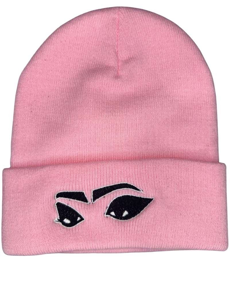 Light pink beanie embroidered with black eyes outlined in white