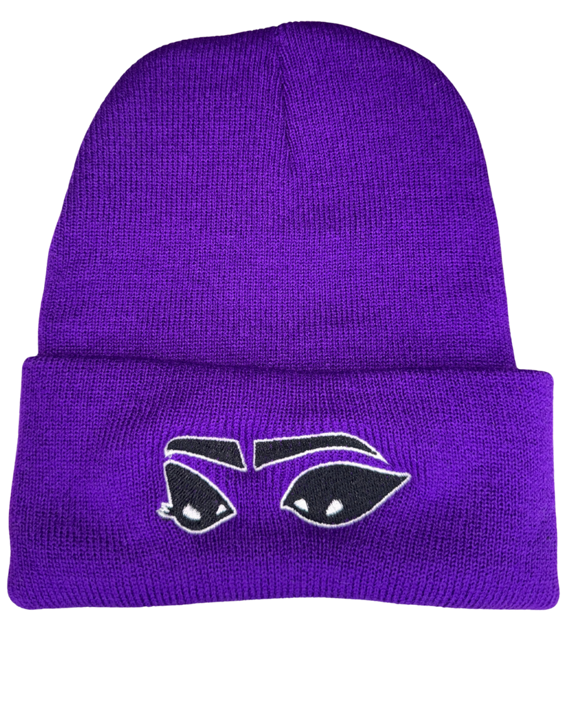 Purple beanie embroidered with black lovely eyes - outlined in white.