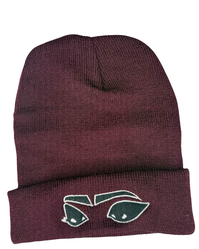 Maroon beanie embroidered with eyes outline sun white stitching.