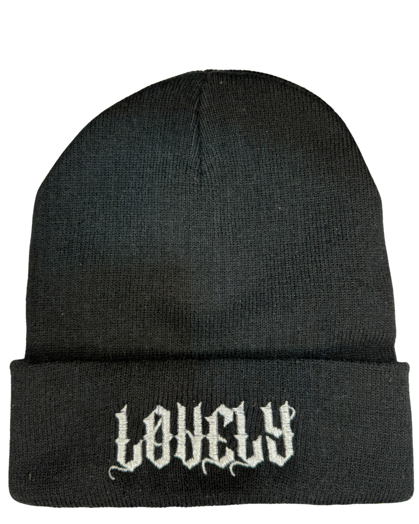 Black beanie embroidered with white stitching.
